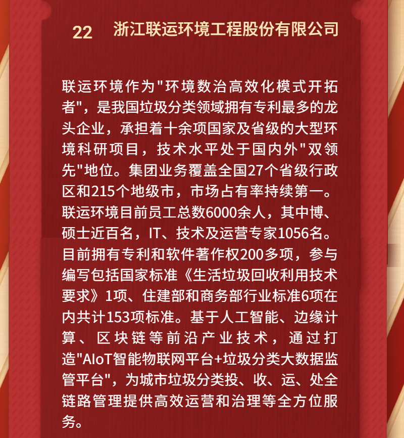 日前,浙江省智慧城市促進會開展的“2021年度浙江省智慧城市建設(shè)先進單位、創(chuàng)新人物及浙江省智慧城市促進會突出貢獻獎”評選活動結(jié)果正式揭曉,聯(lián)運環(huán)境憑借在垃圾分類智能化監(jiān)管平臺領(lǐng)域的技術(shù)產(chǎn)品及解決方案的出色表現(xiàn),入選“2021年度浙江省‘智慧城市’先進單位”名單。